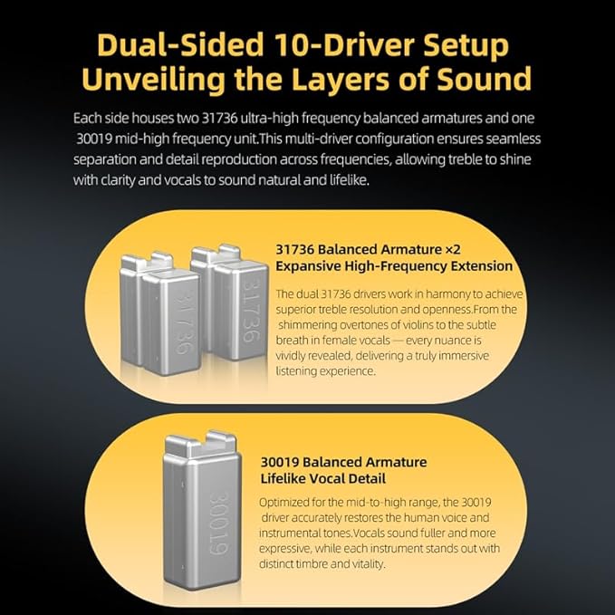 - 【Dual-Sided 10* BA Driver Setup, Unveiling the Layers of Sound】: Each side houses 4*31736 ultra-high frequency balanced armatures and 1*30019 mid-high frequency unit. This multi-driver configuration ensures seamless separation and detail reproduction across frequencies, allowing treble to shine with clarity and vocals to sound natural and lifelike