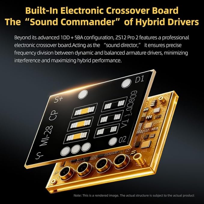 - 【Built-In Electronic Crossover Board, The "Sound Commander" of Hybrid Drivers】: Beyond its advanced 1DD + 5BA configuration, ZS12 Pro 2 features a professional electronic crossover board, Acting as the “sound director", it ensures precise frequency division between dynamic and balanced armature drivers, minimizing interference and maximizing hybrid performance